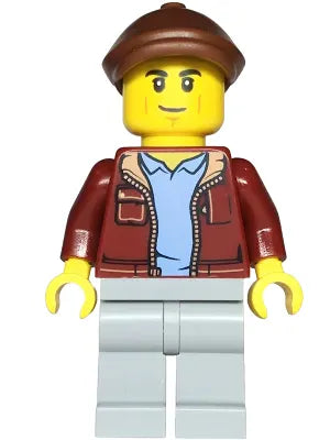 Minifig cty1815 - Car Transporter Driver - Male, Dark Red Jacket, Light Bluish Gray Legs, Reddish Brown Flat Cap