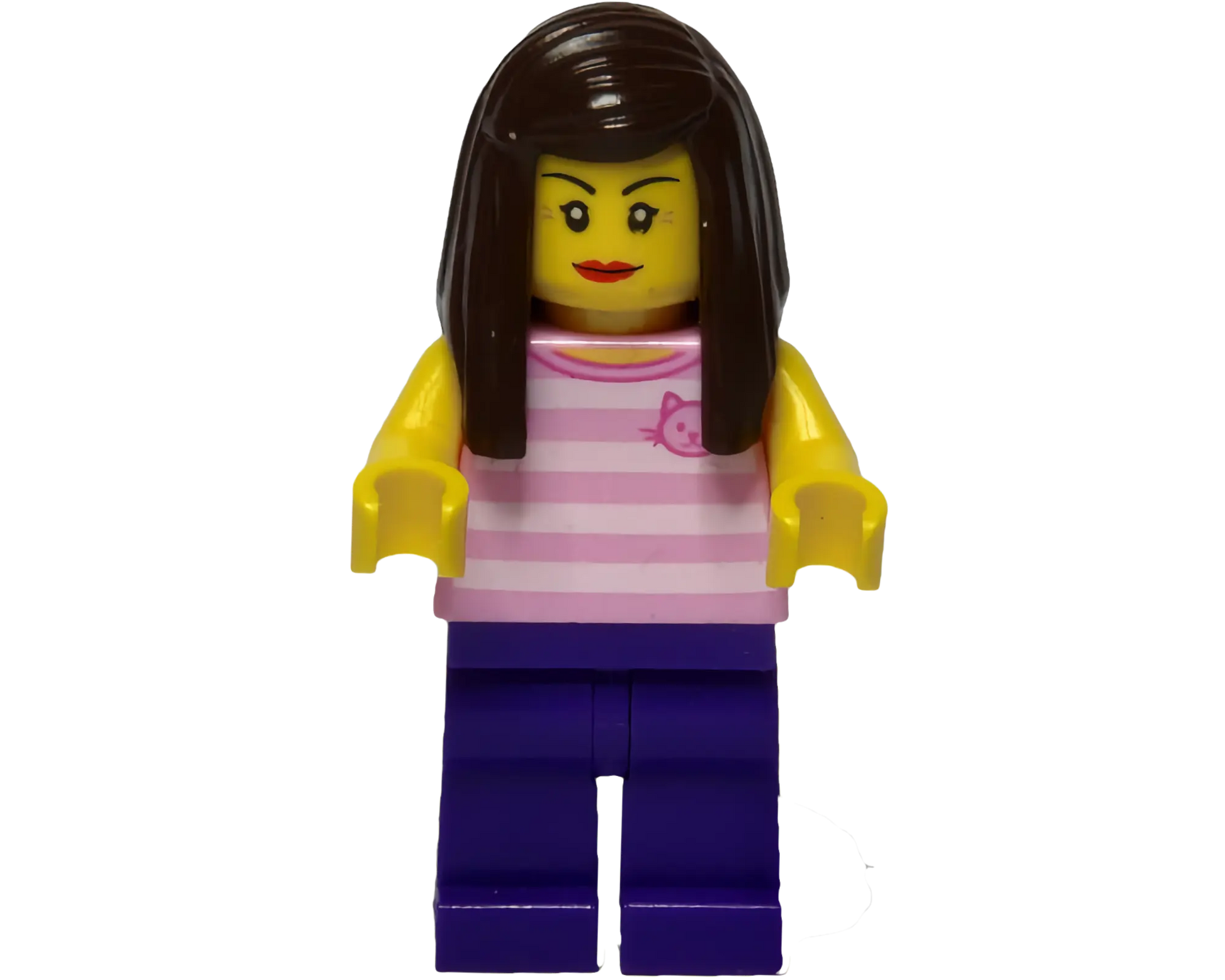 Minifig cty0719 - Rollerskater - Female, Bright Pink Striped Shirt with Cat Head, Dark Purple Legs, Dark Brown Long Hair, Red Lips, Black Skates